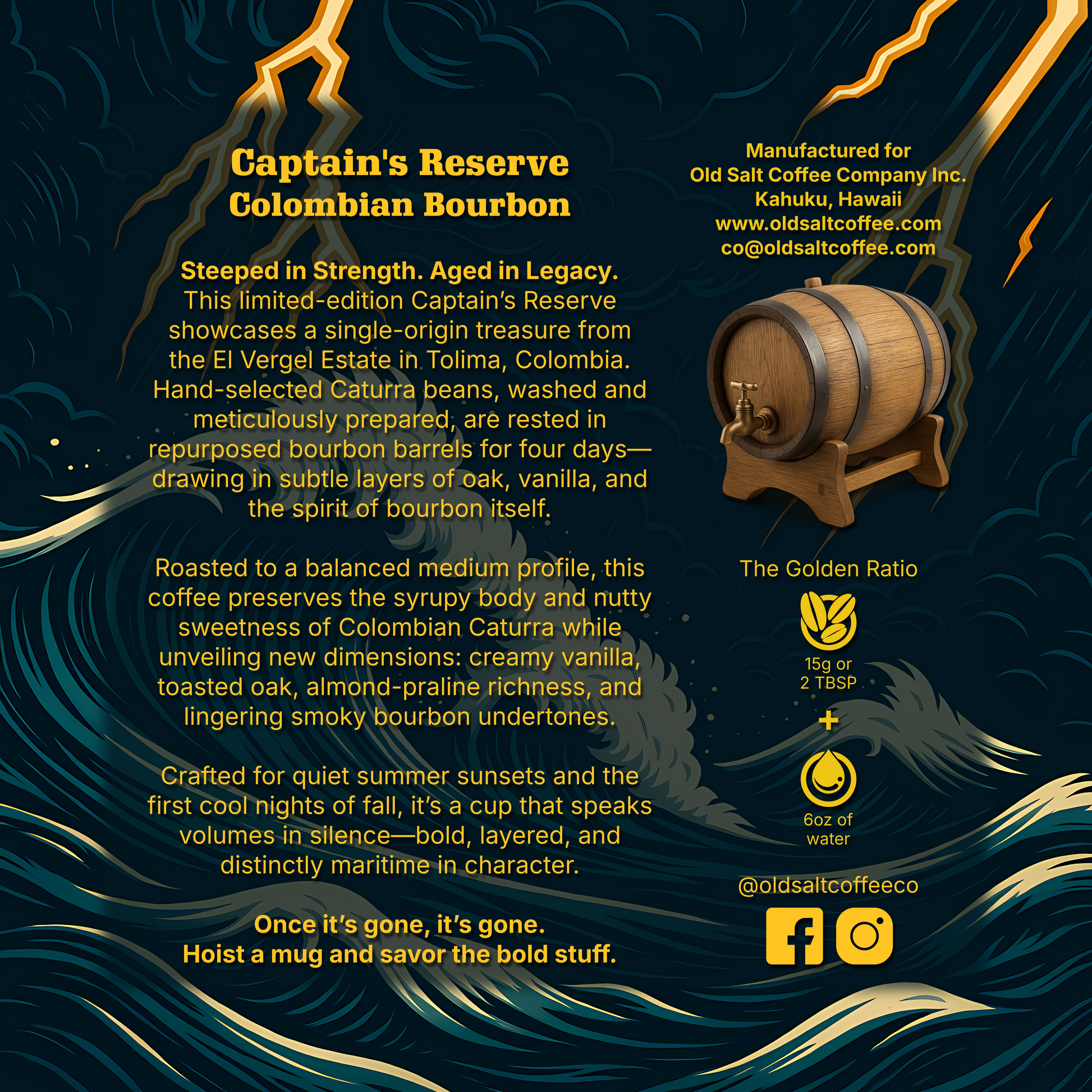 Every Captain’s Reserve release is fleeting, rare, and unforgettable. This Colombian Bourbon edition captures maritime character with depth and distinction, made for those who seek both heritage and adventure in their coffee.