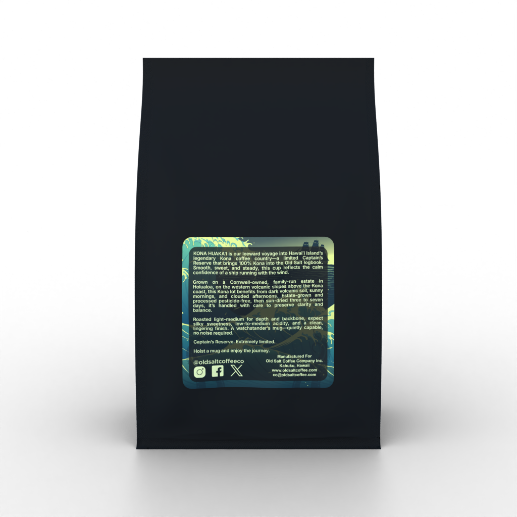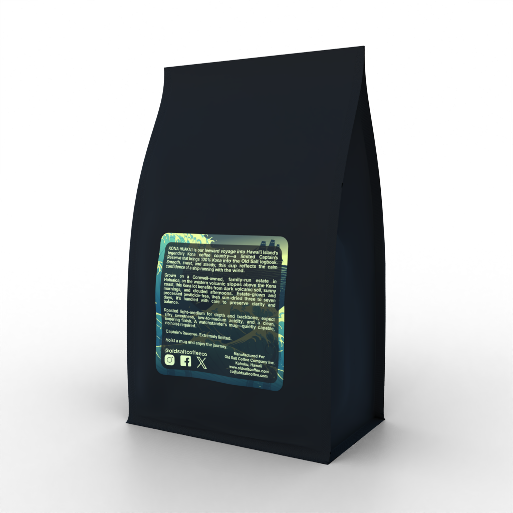 With respect to that leeward heritage, we opened the Old Salt playbook and produced a fitting brew: 100% Kona, light–medium roasted, and built for Shipmates who want a cup with backbone.