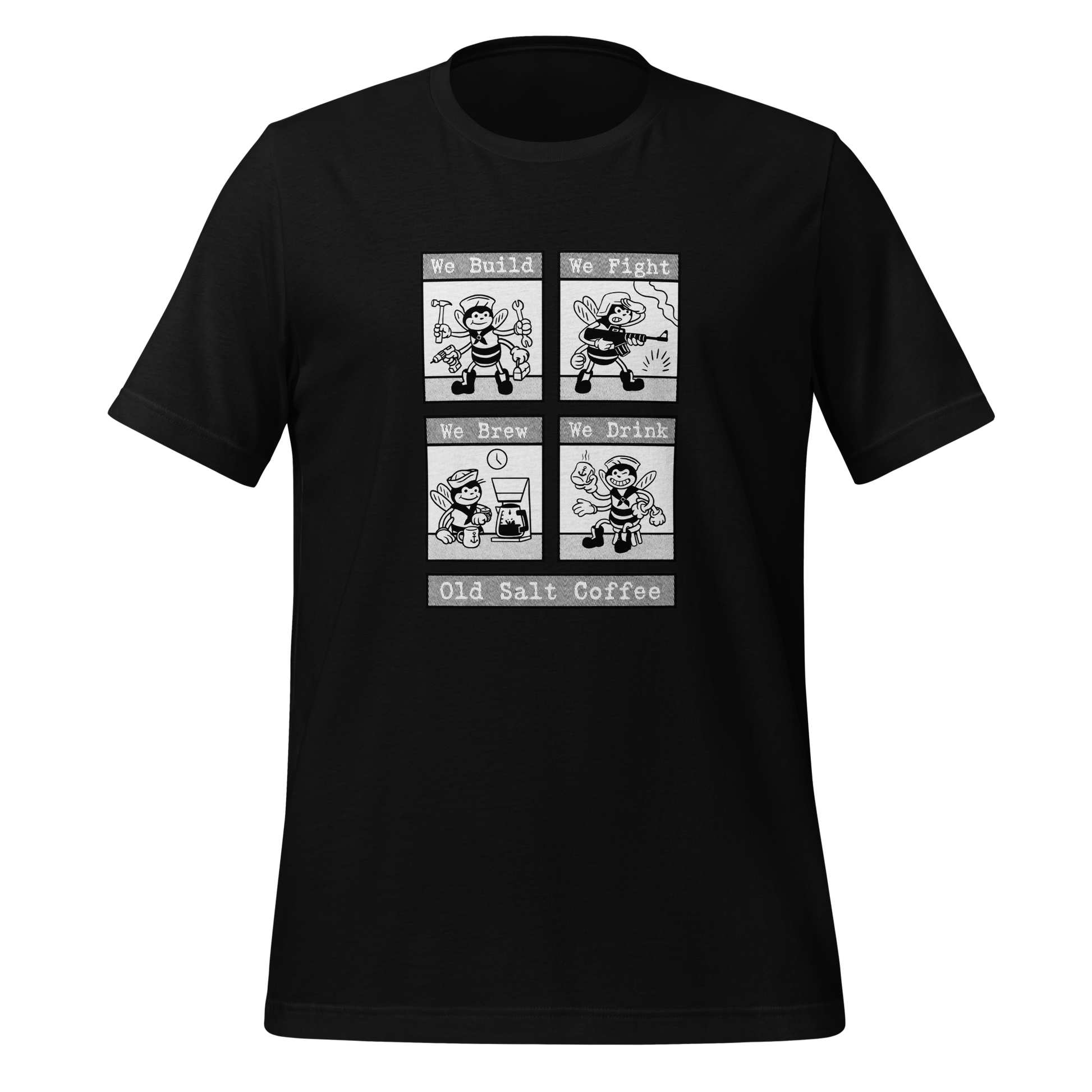 FREE SHIPPING! Celebrate the spirit of versatility and dedication with our "Seabee Saga" T-shirt. This graphic tee brings to life a unique four-panel comic, featuring an anthropomorphic bee, the Seabee, embodying the multifaceted roles and resilience of those who serve.