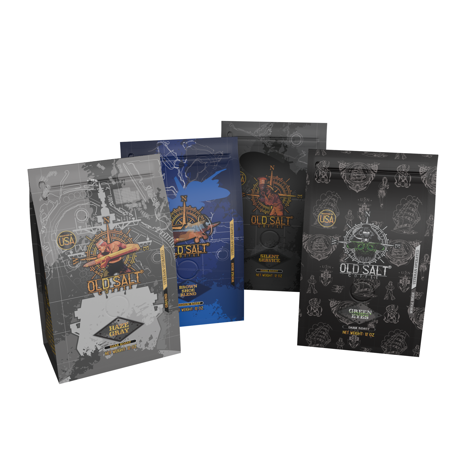 Get our four original coffees in one salvo - The Whole Force. Brown Shoe Blend, Silent Service, Haze Gray and Green Eyes